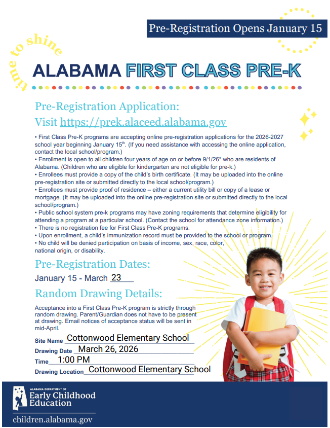 Pre-Registration for the 2026-2027 school year for Pre-K opens on Thursday, January 15 and will end on Monday, March 23. Must be four years of age on or before September 1, 2026.Must provide child'...